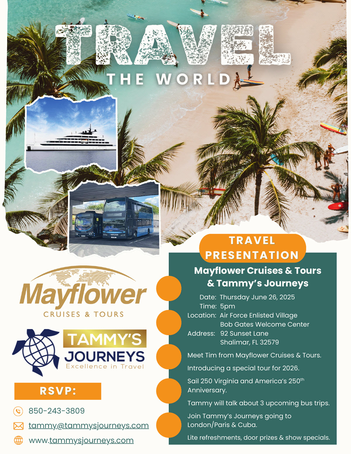 For more information: tammy@tammysjourneys.com or Phone: 850-243-3809